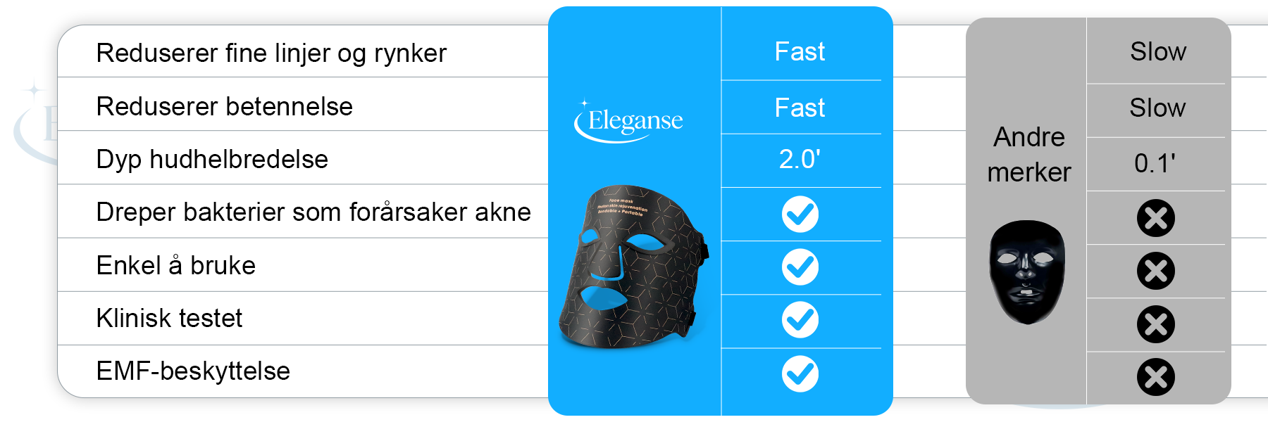 Derfor er alle funksjonene i Eleganse LED-masken – fra den smarte, håndfrie designen til den målrettede fototerapien og den komfortable silikonpassformen – skreddersydd akkurat for deg. Det er ikke bare et skjønnhetsverktøy, det er din personlige «glødgjenoppretter» som hjelper deg med å forvandle huden din og gjenvinne din utstråling uten anstrengelse. Velg Eleganse LED-masken for å nyte hvert øyeblikk av selvpleie uten anstrengelse.